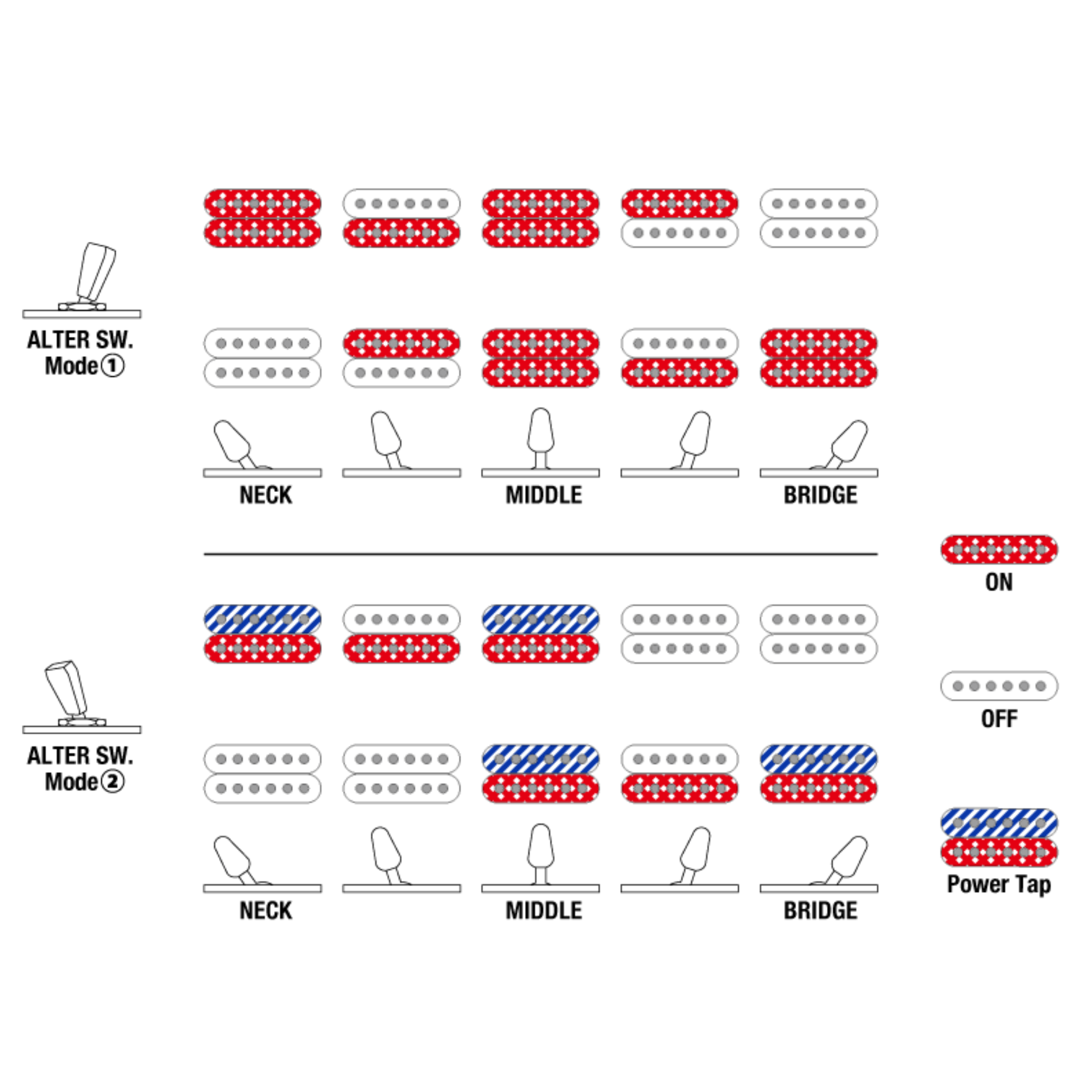 Os captadores Ibanez Modern Custom apresentam uma configuração de humbucker duplo com ímãs de alnico em V. Eles oferecem timbre potente e resposta rápida, combinando especialmente bem com overdrive e distorção.